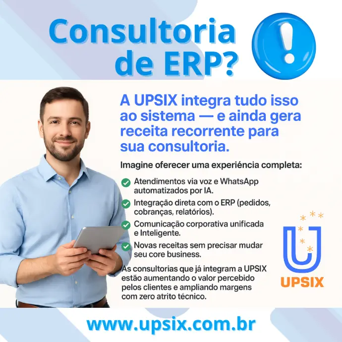 A UPSIX desenvolveu uma metodologia de integração que permite unificar dados operacionais, financeiros e de relacionamento do ERP em uma camada inteligente de comunicação Empresarial, via voz, WhatsApp, IA e relatórios automatizados.